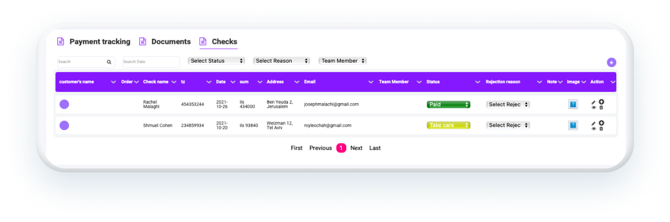 תוכל לבחון את הסטטוס של כל לקוח בצורה שקופה ופשוטה. המערכת המודלרית תאפשר לך להציג את הנתונים החשובים עבורך, כך שעל כל לקוח תוכל לקבל אינפורמציה מלאה: פרטים אישיים, מצב תשלום, מסמכים, פעולה רצוייה ועוד.