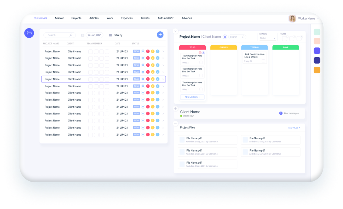 באמצעות המערכת תוכל לנהל באופן יעיל את כלל הפרויקטים הפעילים בחברה. התאמה אישית מלאה של התצוגה מאפשרת לך להתחבר למידע שרלוונטי עבורך בכל שלב ושלב. קבע עדיפות, הגדר לוח זמנים, הקצה משימות לעובדים, הוסף אוטומציות חכמות ועוד הרבה יותר. כל המידע הדרוש לך ולעובדים בחברה בכדי לתפעל פרויקט בצורה הטובה ביותר במערכת אחת חכמה.