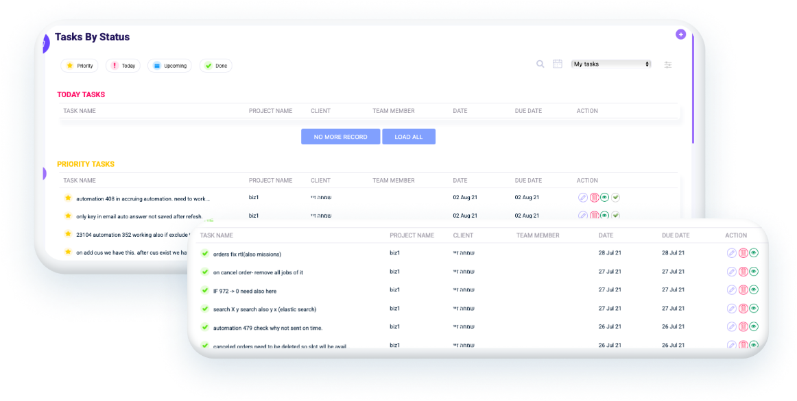 ניהול המשימות השוטפות מעולם לא היה יעיל יותר. המערכת מאפשרת לך יצירת משימות, הקצאה לעובדים, תעדוף על פי דחיפות או חשיבות, מעקב אחר הסטטוס של כל משימה, חלוקה לתיקיות על פי איפיון ועוד.
