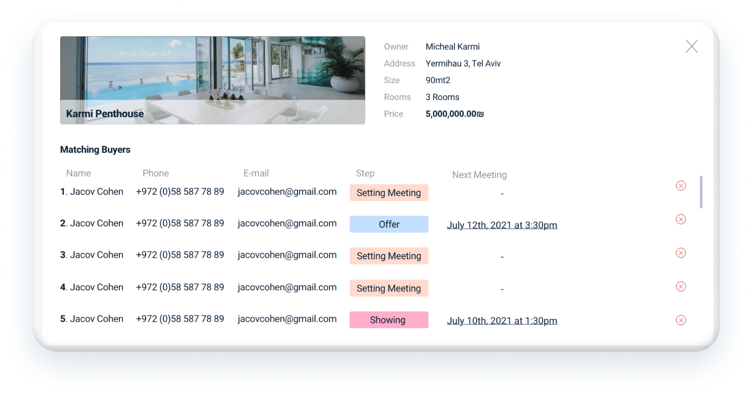 המערכת החכמה מאפשרת לנהל את תהליך ההתאמה של נכס לקונה פוטנציאלי באופן שקוף ומדויק בשבילך. המערכת מציגה את פרטי הנכס המלאים בצמוד לכל הקונים הפוטנציאלים. נהל את התקשורת שלך עם הלקוחות, יומן הפגישות וכל המידע הדרוש לקדם את המכירה ישירות מתוך המערכת.