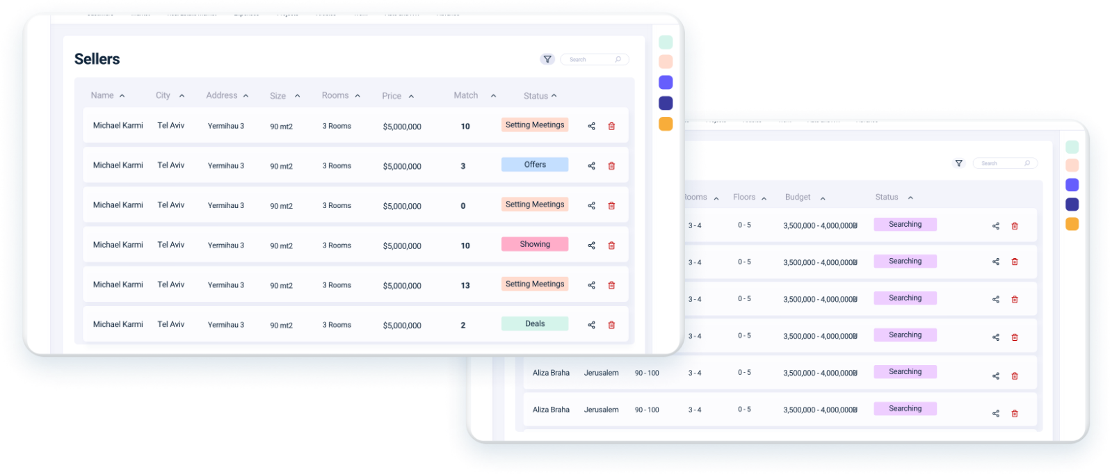 השוואת צרכי הקונה ופרטי הנכסים המוצעים בצורה שקופה ונוחה עבורך ועל ידך לקונה. המערכת החכמה שלנו מאפשרת לך לנהל את כלל תהליך התיווך במקום אחד- פרטים מלאים לגבי הקונה והמוכר העתידיים- כולל פרטי הנכס המלאים, דרישות הקונה המדויקות, תמונות, מחירים, מפרטים, גודל הנכס, מיקום ועוד.