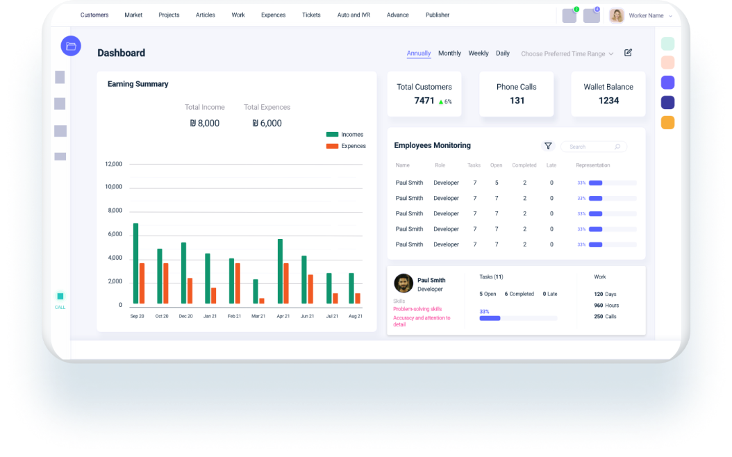 לוח הבקרה הוא הבית שלך בניהול היום יומי השוטף של מערך הטלמרקטינג. באמצעות עריכה והתאמה אישית של הלוח כך שיציג את הנתונים החשובים עבורך תוכל בלחיצת כפתור להתחבר לכל מה שנעשה בכל רגע נתון בעסק: תצוגה חודשית שבועית או יומית של מכירות, צפייה רוחבית בפרויקטים פעילים, הישגי עובדים, ניהול מלאי ועוד הרבה יותר- הכל בתצוגה גרפית נעימה וברורה. לוח הבקרה שלנו תוכנן במיוחד בכדי להקל ולשפר לך את הניהול השוטף.